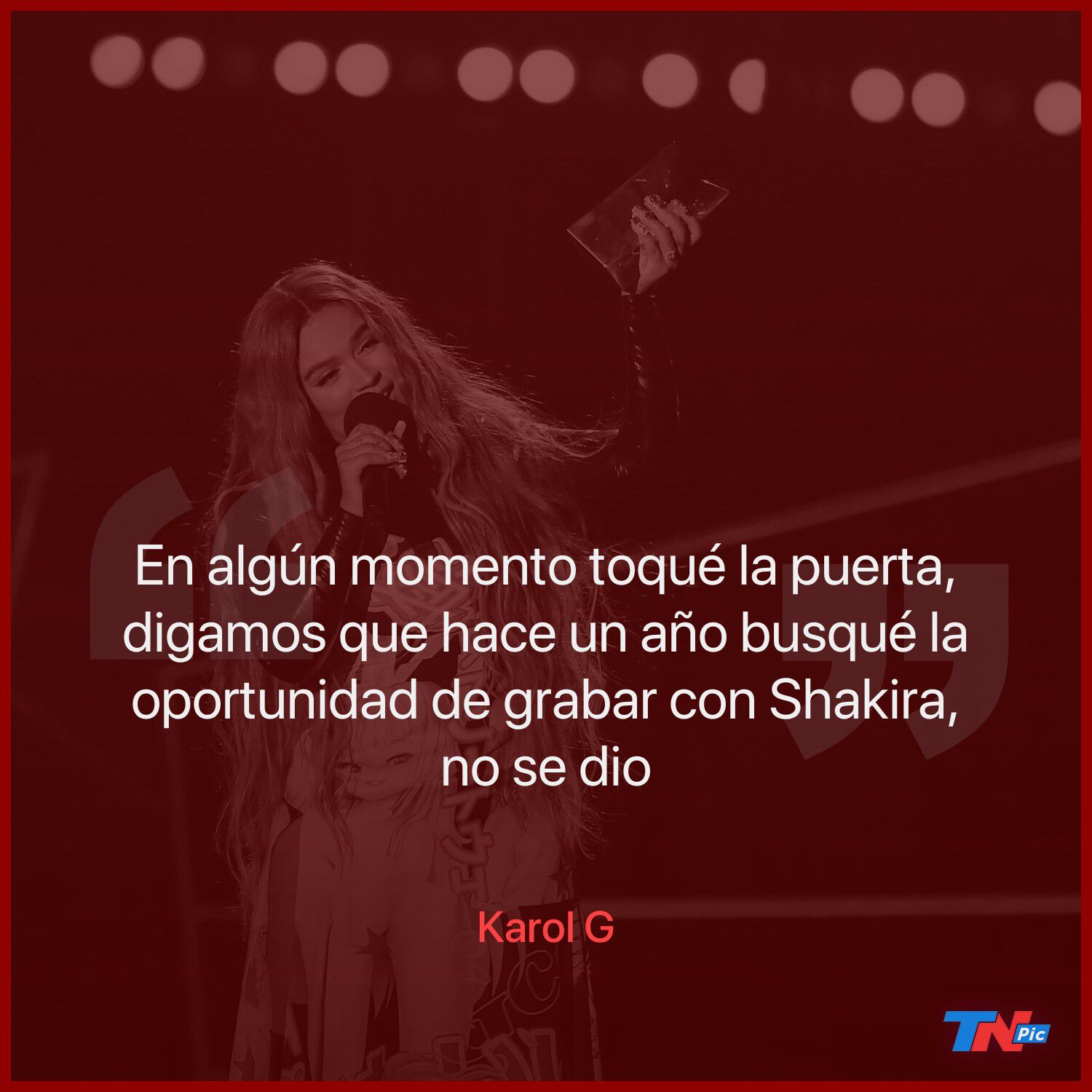 En algún momento toqué la puerta. Digamos que hace un año busqué la oportunidad de grabar con Shakira: no se dio”, confesó Karol G en el programa de TV Suelta la sopa. Sin embargo, comentó que no se dará por vencida: “Vamos ver qué pasa, no digo que no, tampoco digo que sí, va a ser parte de lo que nos depare el futuro; si llega una canción que en mi opinión sea para Shakira, tocaré la puerta de nuevo”.